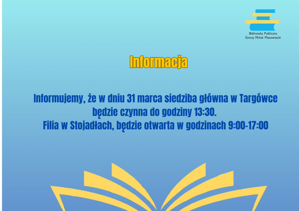Informujemy, że w dniu 31 marca siedziba główna w Targówce będzie czynna do godziny 13:30. Filia w Stojadłach, będzie otwarta w godzinach 9:00-17:00