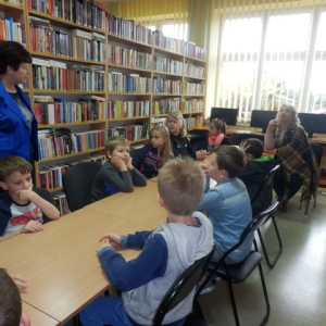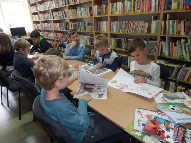 11 października 2016 r. Lekcja biblioteczna dla klasy II b ze Stojadeł. Uczniowie poznają zbiory i katalog biblioteczny.