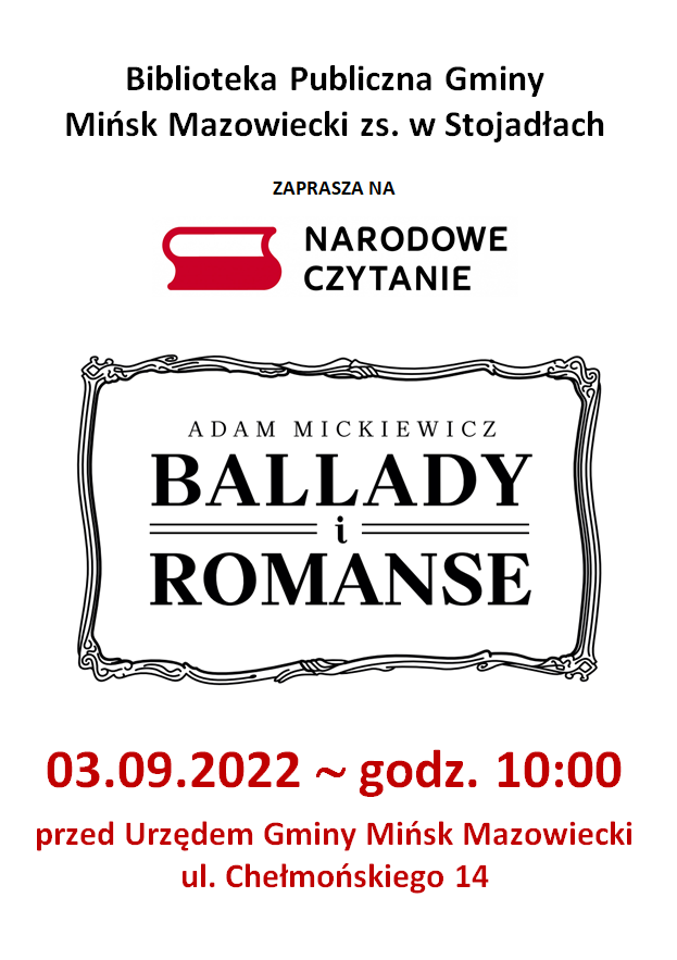 Serdecznie zapraszamy do udziału w 11. edycji „Narodowego Czytania”, które odbędzie się w najbliższą sobotę 3 września 2022 r. o godz. 10:00 przed Urzędem Gminy Mińsk Mazowiecki przy ul. Chełmońskiego 14.