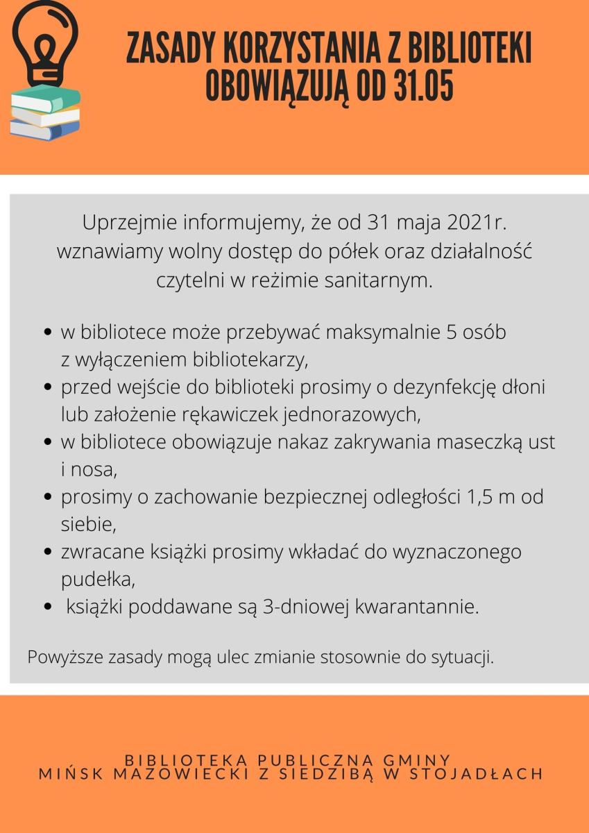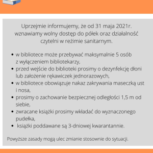 Uprzejmie informujemy, że od 31 maja 2021r. wznawiamy wolny dostęp do półek oraz działalność czytelni w reżimie sanitarnym.