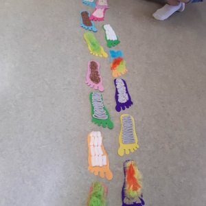 Budowaliśmy wspólnie wieże z miękkich, barwnych krążków, pojawiła się sensoryczna ścieżka, która gilgotała maluszki w stópki, było rzucanie do celu, segregowanie kolorów i szukanie skarbów w kaszy gryczanej.