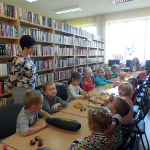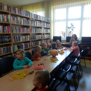 Tematem przewodnim spotkania było poszukiwanie śladów jesieni. Nasi goście wysłuchali fragmentu opowiadania Agatka na tropach jesieni oraz poznały biblioteczne nowości dla najmłodszych.