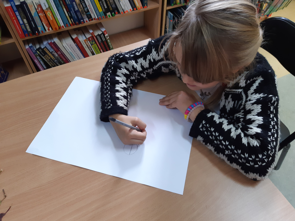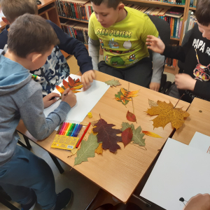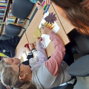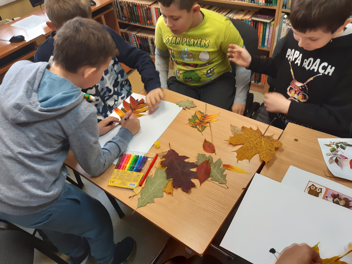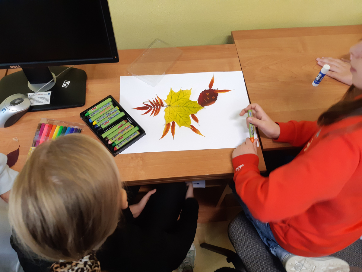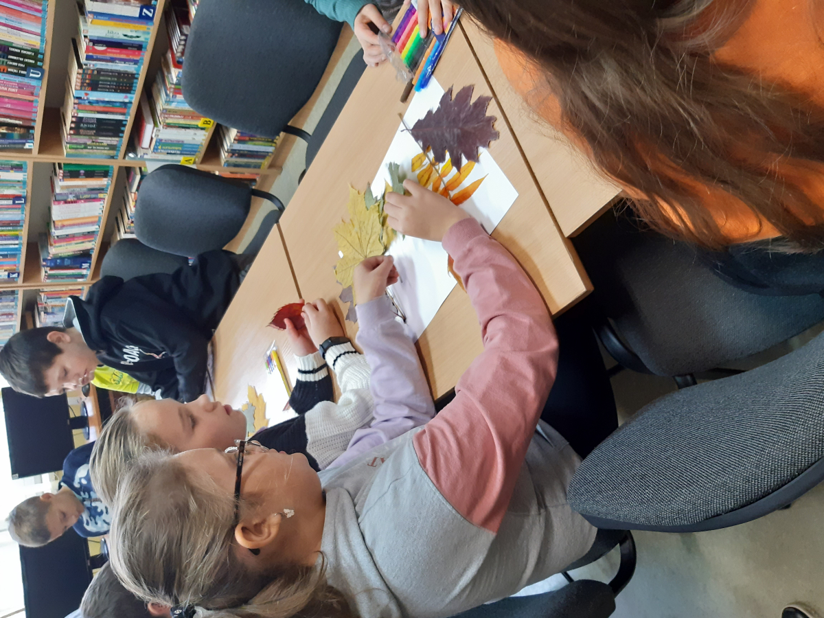 Pierwszą z nich była Tosia Bąk, 9-latka pasjonująca się malarstwem, której prace od kilku tygodni można obejrzeć w naszej bibliotece. Młoda artystka opowiedziała rówieśnikom o swojej twórczości, inspiracjach, warsztacie pracy oraz planach związanych z rozwijaniem swoich zainteresowań. Była to również lekcja interpretacji dzieła. Dzieci opisywały poszczególne elementy obrazu, zastosowane barwy i wrażenia, jakie wywołują. Dowiedziały się, że nie istnieje jedyna słuszna interpretacja dzieła sztuki – każdy z nas może interpretować je na swój sposób i każdy z tych sposobów jest prawidłowy! Podczas spotkania także uczestnicy wcielili się w rolę artystów i stworzyli wspaniałe kompozycje z jesiennych liści.