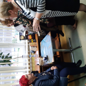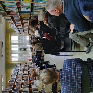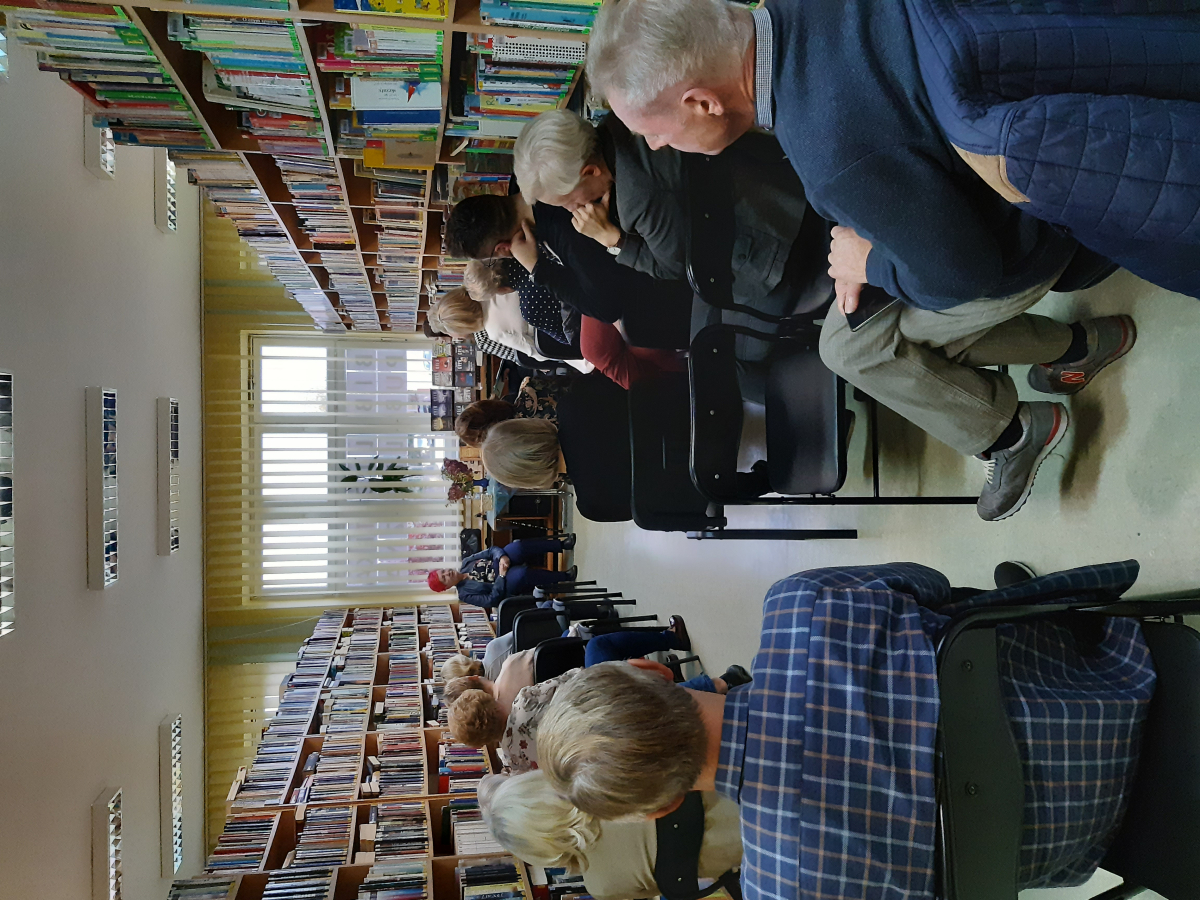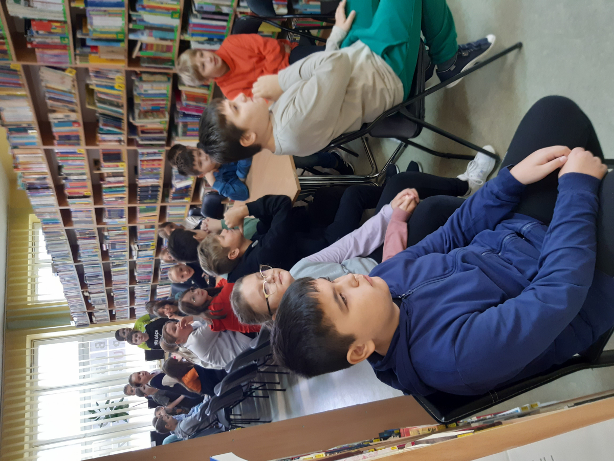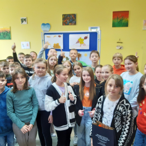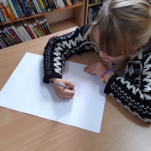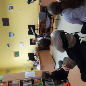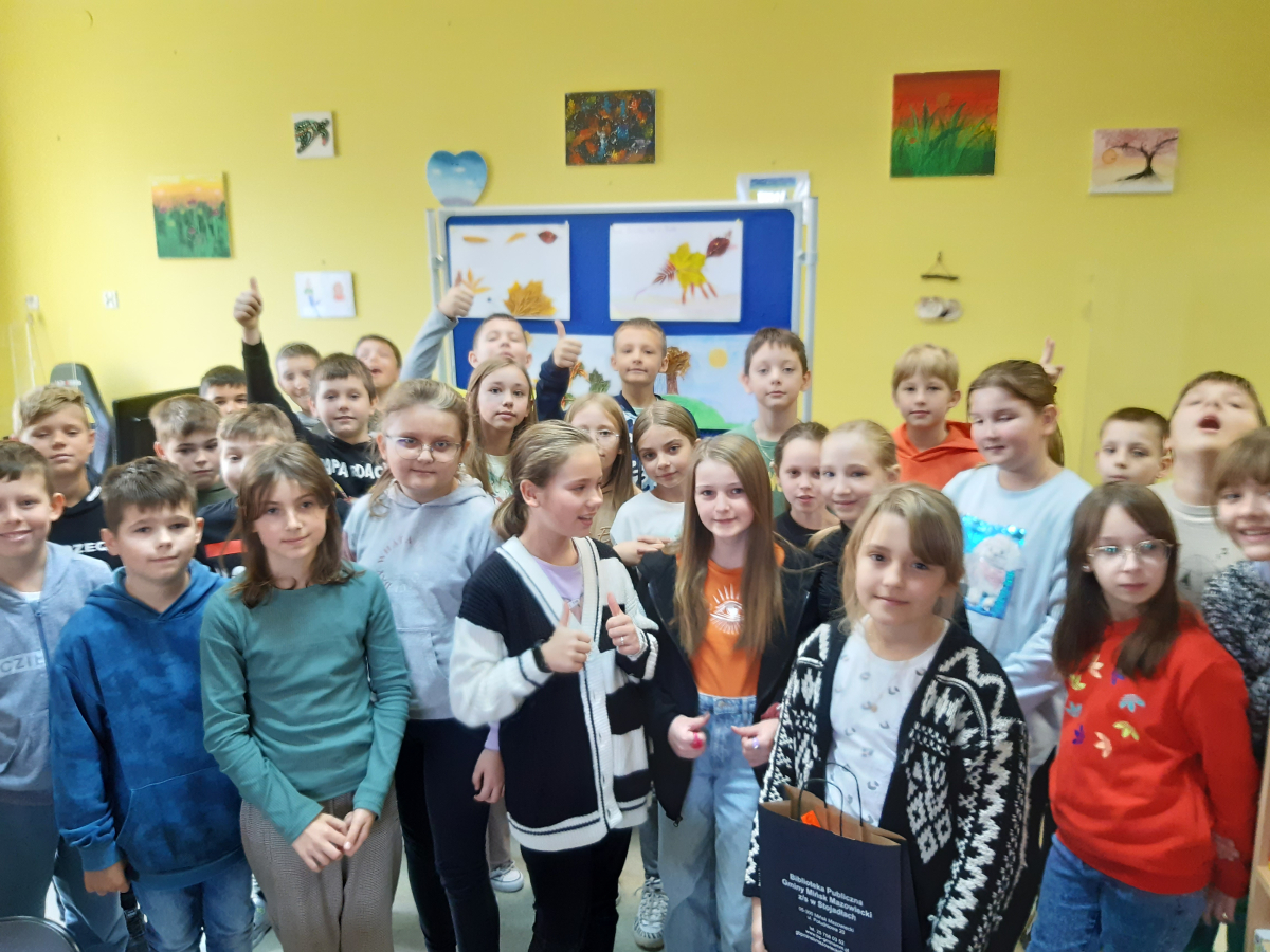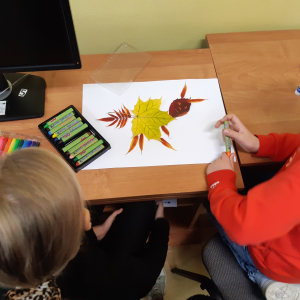 Pierwszą z nich była Tosia Bąk, 9-latka pasjonująca się malarstwem, której prace od kilku tygodni można obejrzeć w naszej bibliotece. Młoda artystka opowiedziała rówieśnikom o swojej twórczości, inspiracjach, warsztacie pracy oraz planach związanych z rozwijaniem swoich zainteresowań. Była to również lekcja interpretacji dzieła. Dzieci opisywały poszczególne elementy obrazu, zastosowane barwy i wrażenia, jakie wywołują. Dowiedziały się, że nie istnieje jedyna słuszna interpretacja dzieła sztuki – każdy z nas może interpretować je na swój sposób i każdy z tych sposobów jest prawidłowy! Podczas spotkania także uczestnicy wcielili się w rolę artystów i stworzyli wspaniałe kompozycje z jesiennych liści.