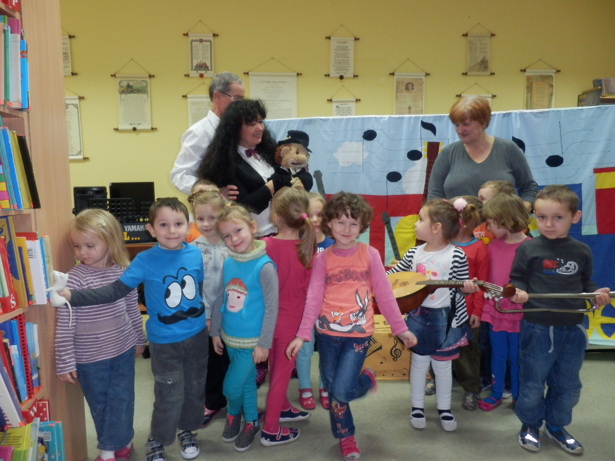 Wesoły pociąg to tytuł muzycznej sztuki teatralnej wykonanej przez aktorów Agencji Artystycznej Dur-Moll z Warszawy. Agencja istnieje od 1994 r. a jej założycielami jest małżeństwo muzyków Ewy i Czesława Matrybów. To właśnie oni, w dwóch spektaklach bawili naszych najmłodszych czytelników ze szkół w Starej Niedziałce i Stojadłach. Ogółem przedstawienie obejrzało 90 osób. A było na co popatrzeć i czego posłuchać. Dzieci, oprócz wspaniałej gry aktorów, poznały również niezwykłego dyrygenta orkiestry Stefana (lalkę) oraz wiele instrumentów muzycznych min.: obój, ksylofon, akordeon, skrzypce, keyboard, mandolinę. Poznały zasady gry w orkiestrze, strojenie instrumentów oraz bezbłędnie rozpoznały ich brzmienie. Kolejne spotkanie z aktorami agencji Dur-Moll w maju 2014 r.
