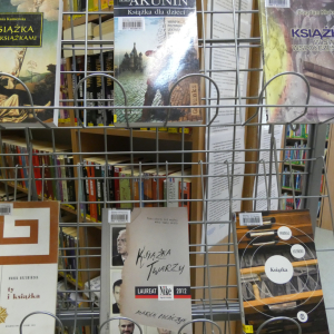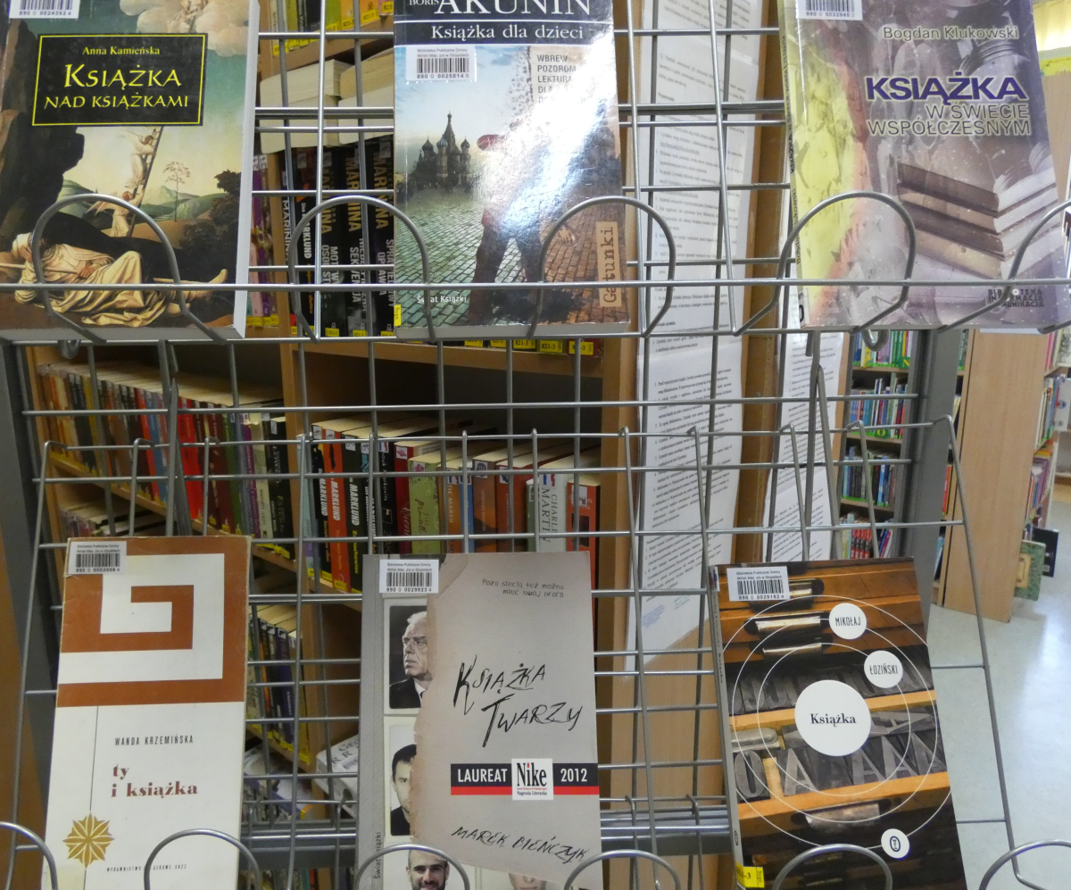 Zaczynamy rozwiązywanie zagadek. Jakie jedno wspólne słowo pojawia się na książkach z wystawki? To słowo jest pierwszą częścią cytatu.
